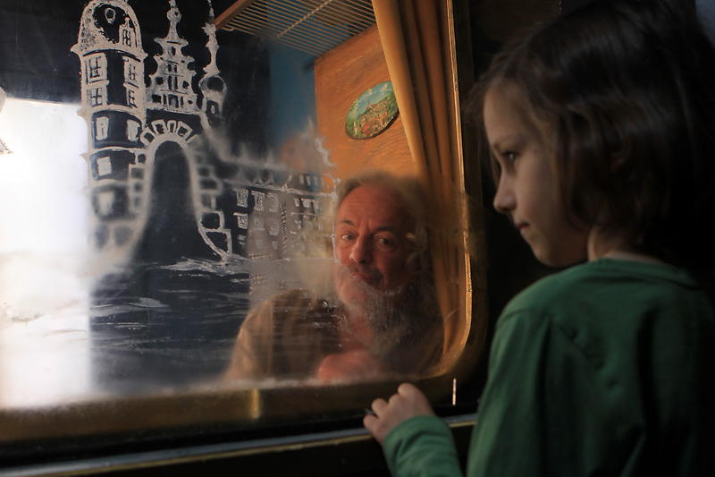 Killing time on a long train journey: a youngster daubs the steamed up window panes with fantasy landscapes. At the station a second train arrives at the adjacent platform, revealing a fellow passenger’s passion for travel and the arts.