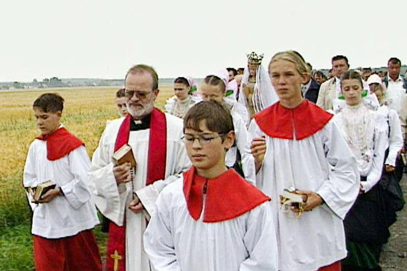 With Andreas taking part in the Easter riding process, Michaela singing Sorbian church songs and the two of them on a pilgrimage to Rosenthal, the viewer encounters an apparently thriving culture. Discussions with a Ralbitz priest highlight how heavily this culture is shaped by Catholicism and its unifying power. At the same time however a sermon is preached against the "godless mischief" of local youngsters and the braška complains of the growing influence of German on Sorbian weddings. On a similar note Michaela prefers to marry in white rather than traditional costume. The idyll is fragile, despite the haunting lyrics of Měrćin Weclich, which emphasise the importance of remembering one's roots.